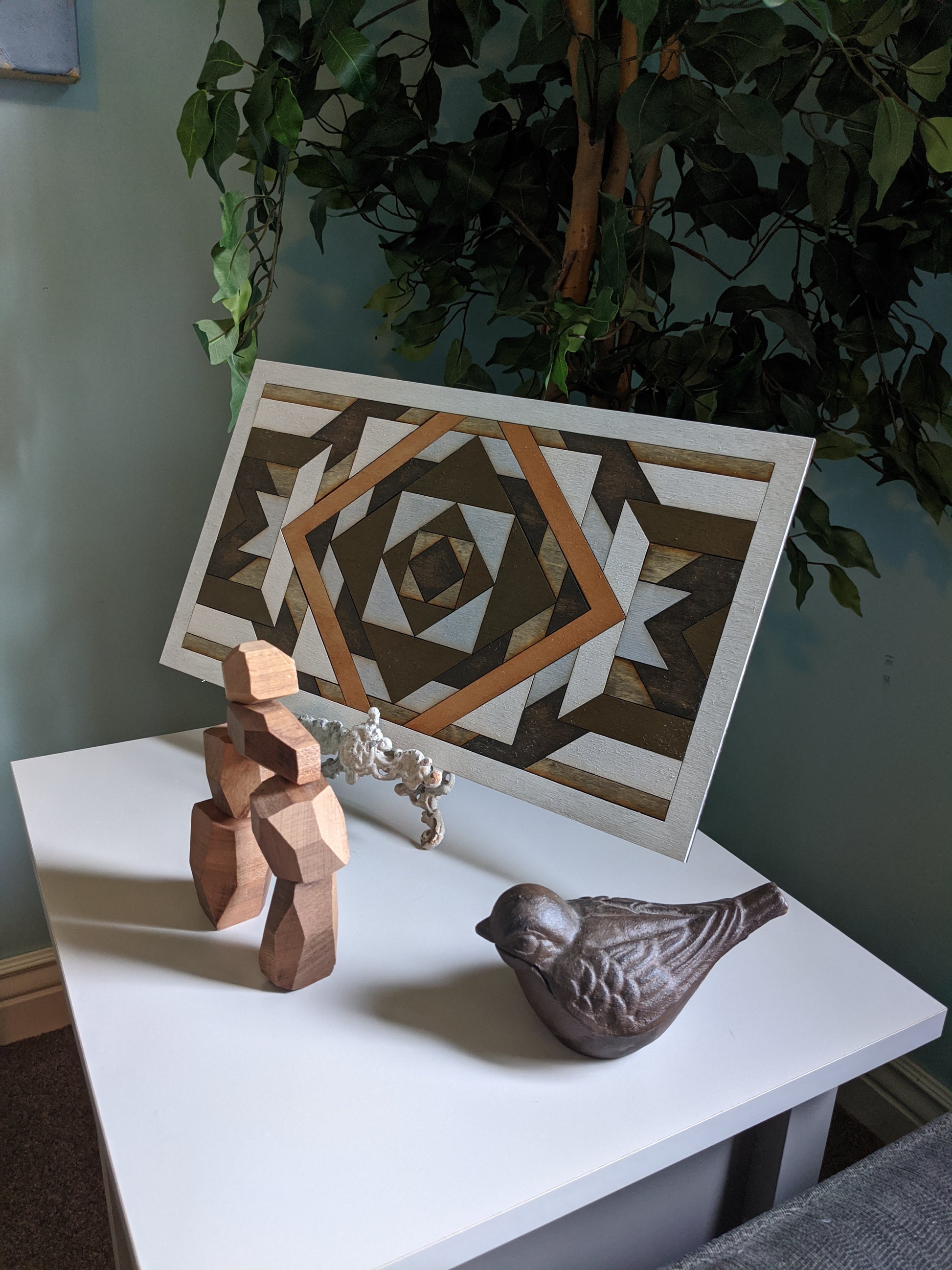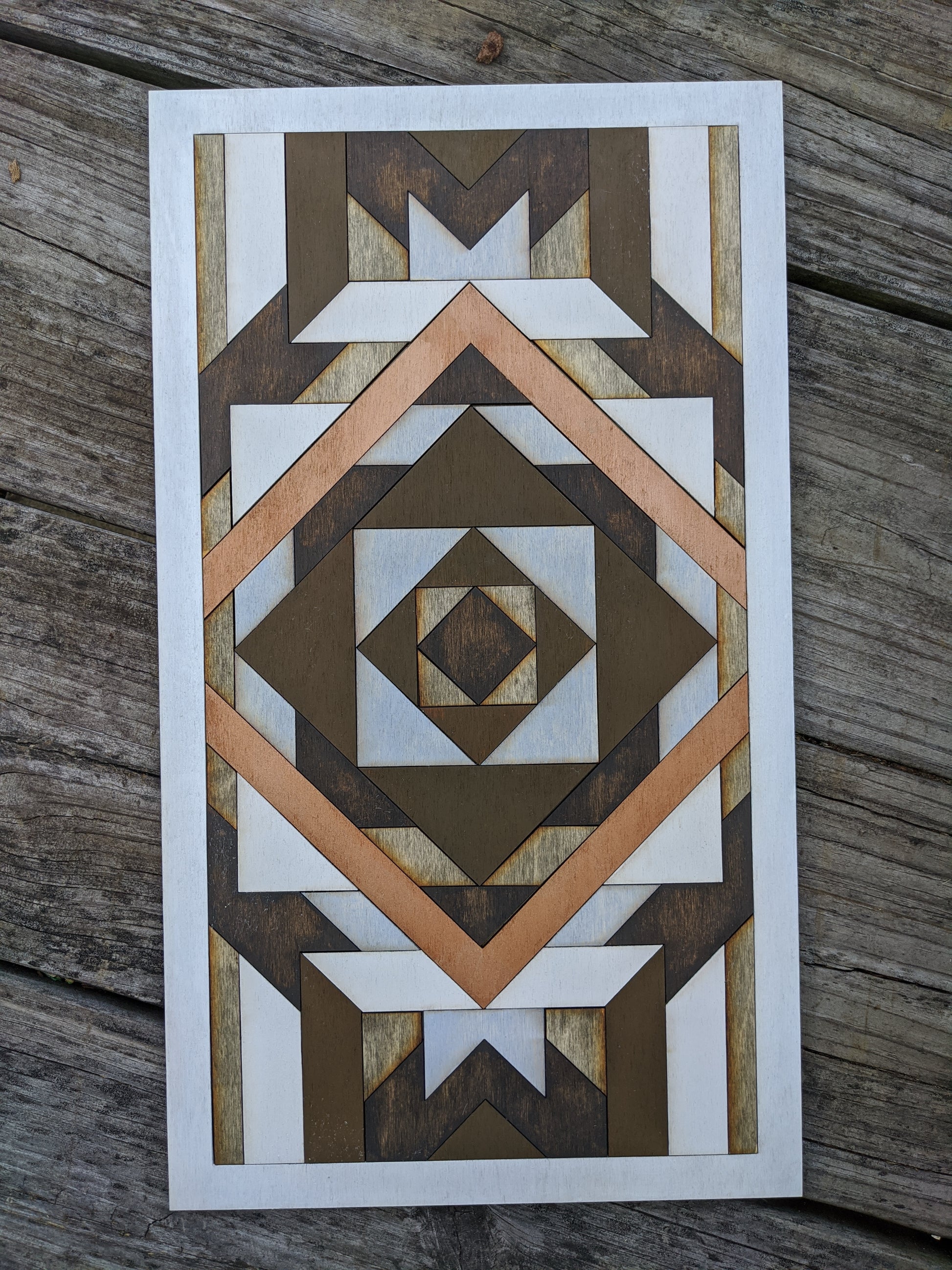 This piece is a perfect party project! available in two sizes Small (18 x 10) and Large (24 x 13) So many options to make this your very own unique piece of art! This example uses some basic wood stains and watered down acrylic paint. This quilt is scored underneath the pieces to help guide you in assembly. The easy-to-follow instructions make construction simple, and the wide range of sizes and customization options allows you to create a one-of-a-kind piece of art. Enjoy the satisfaction of making your own product with a personalized touch.