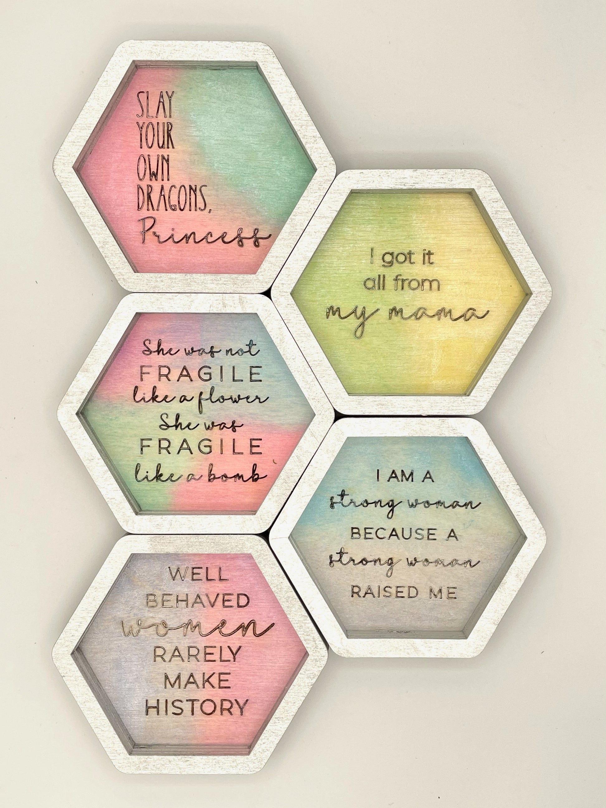 This file contains the pieces and designs for five Mom/Strong Women/Girl Power theme dishes. It comes with the sayings shown, but you an easily import it into your favorite design program and change out the words. If you have a large laser, you can cut this directly from this file. If you have a GLOWFORGE the file contains dishes grouped by two other colors. This will allow you to move them around when you upload it directly in to Glowforge.