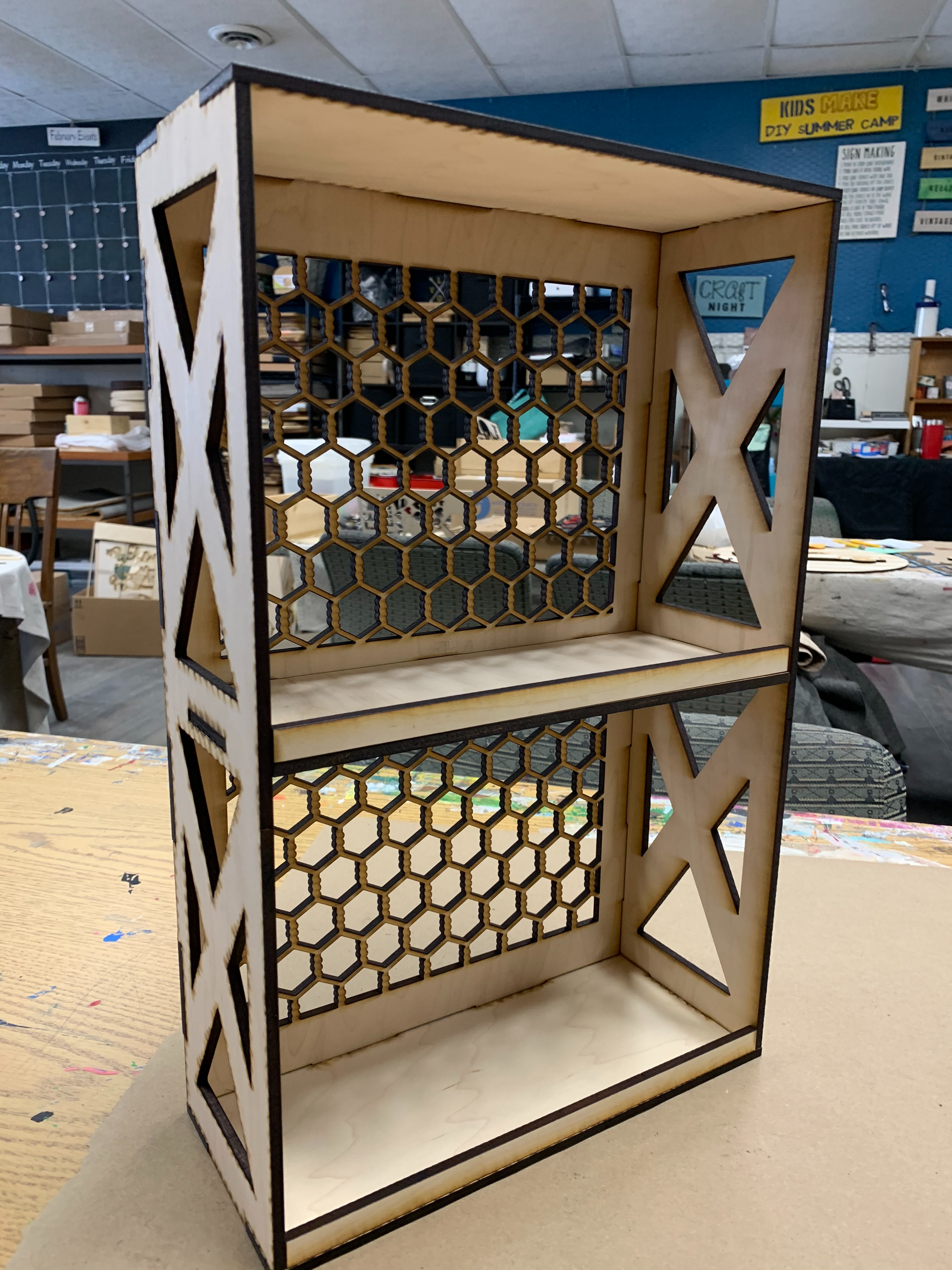 This versatile two-tiered shelf measures 17x10.8" and is approximately 4" deep. It nicely holds many of the tiered tray kits.
