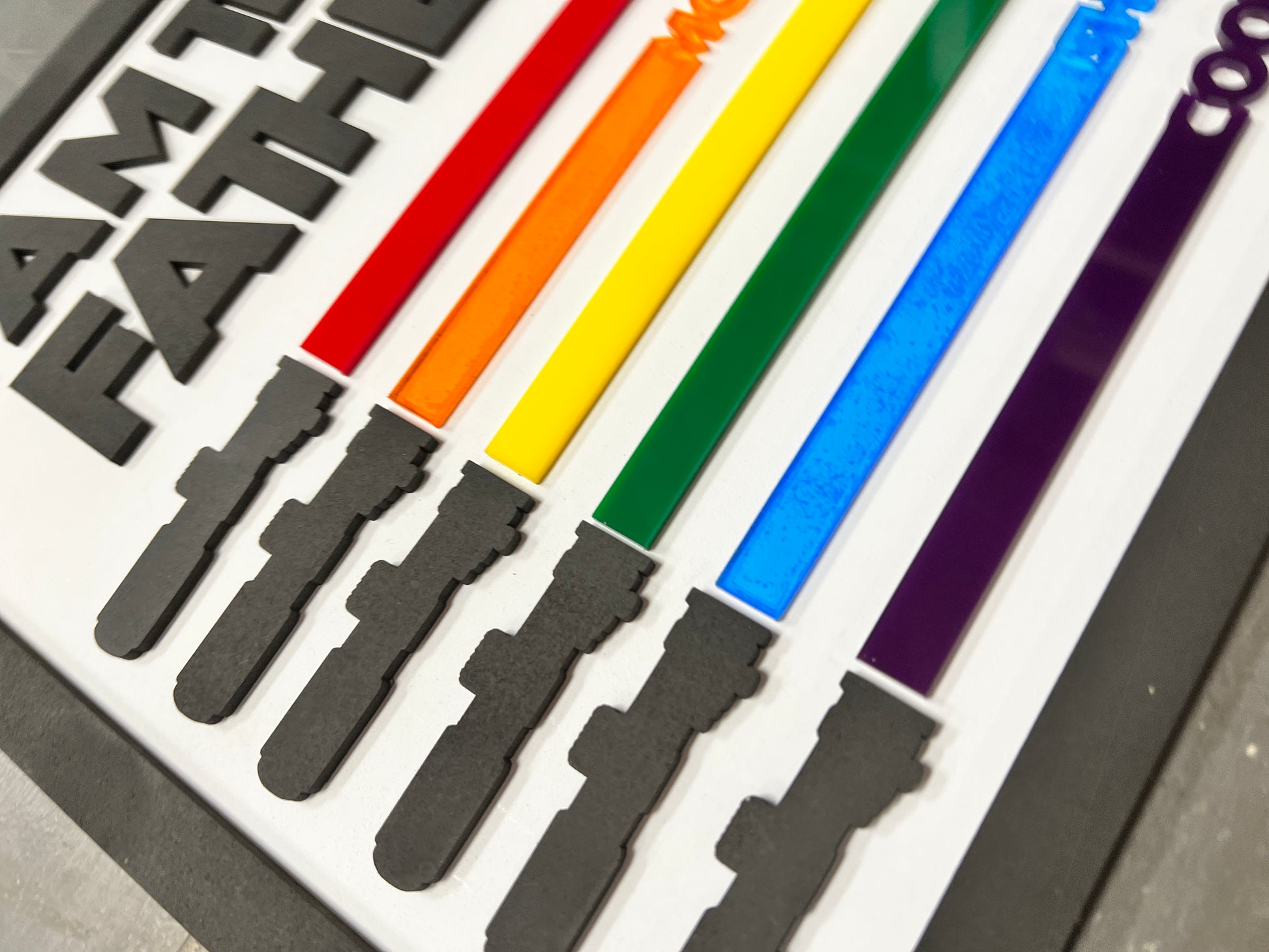 This is a perfect gift for the Star Wars fan! Choose either the laser engraved cutting board or the full color sign with acrylic cut outs. Order now for pick up before Father's day. Allow 3-5 days for making!