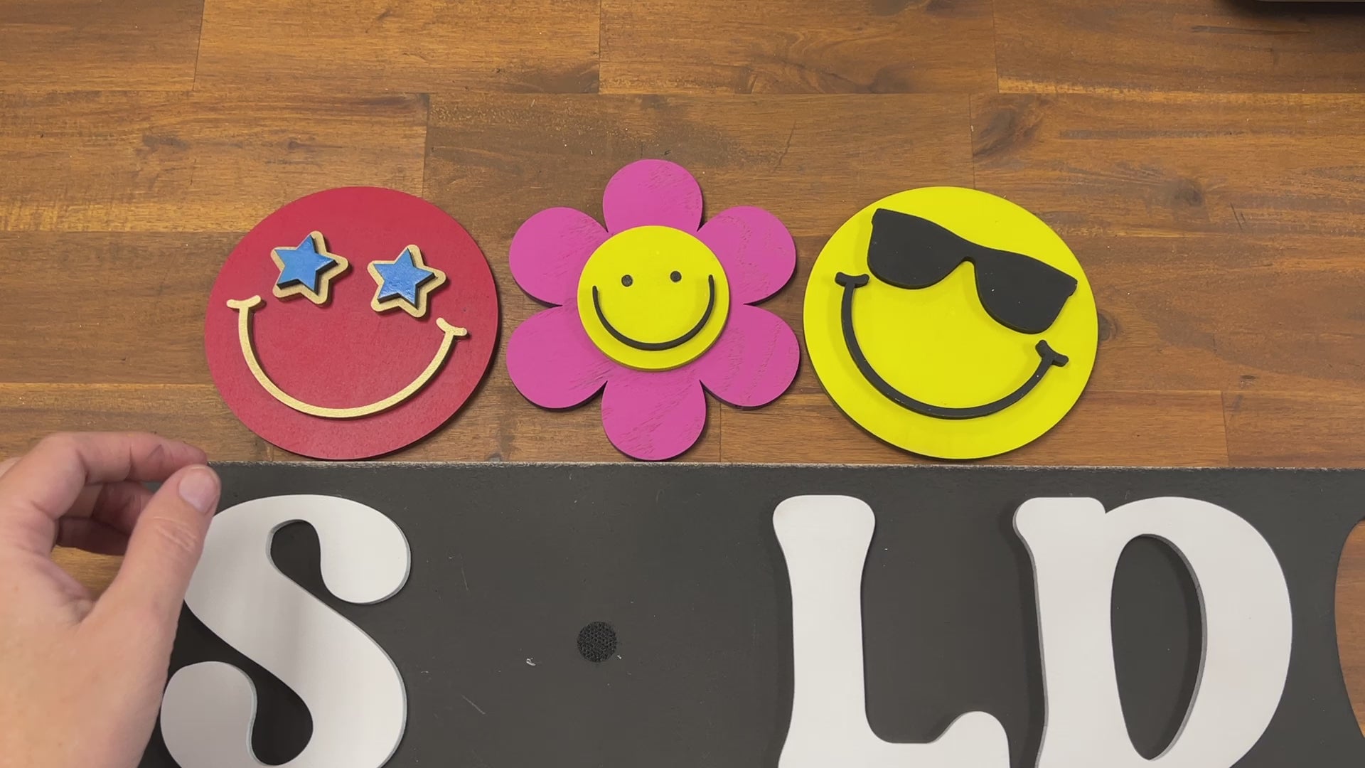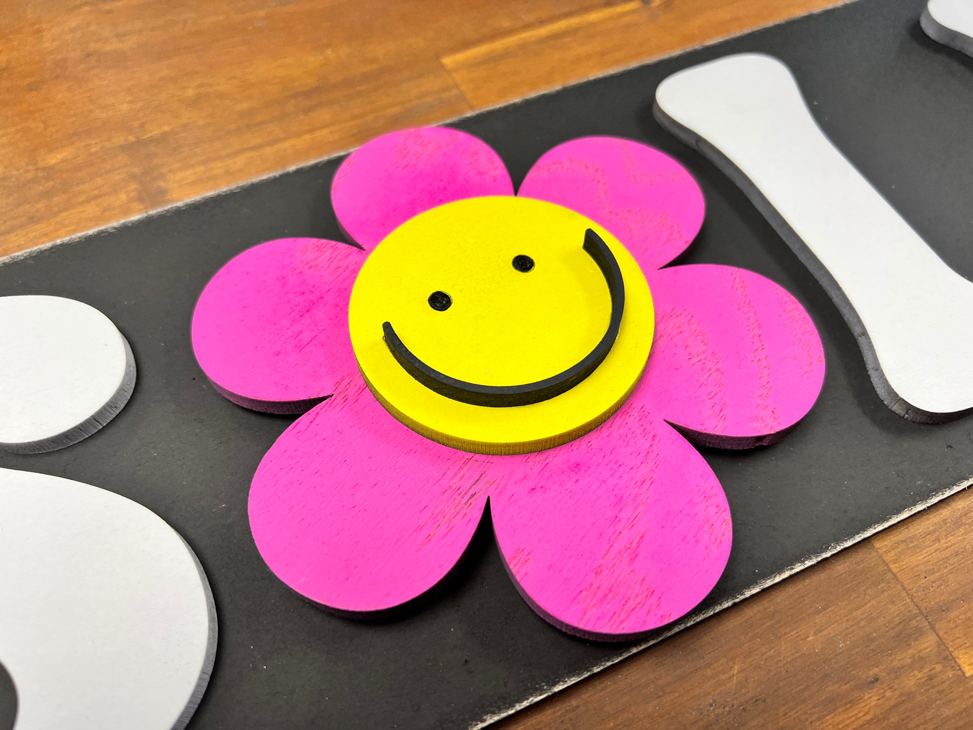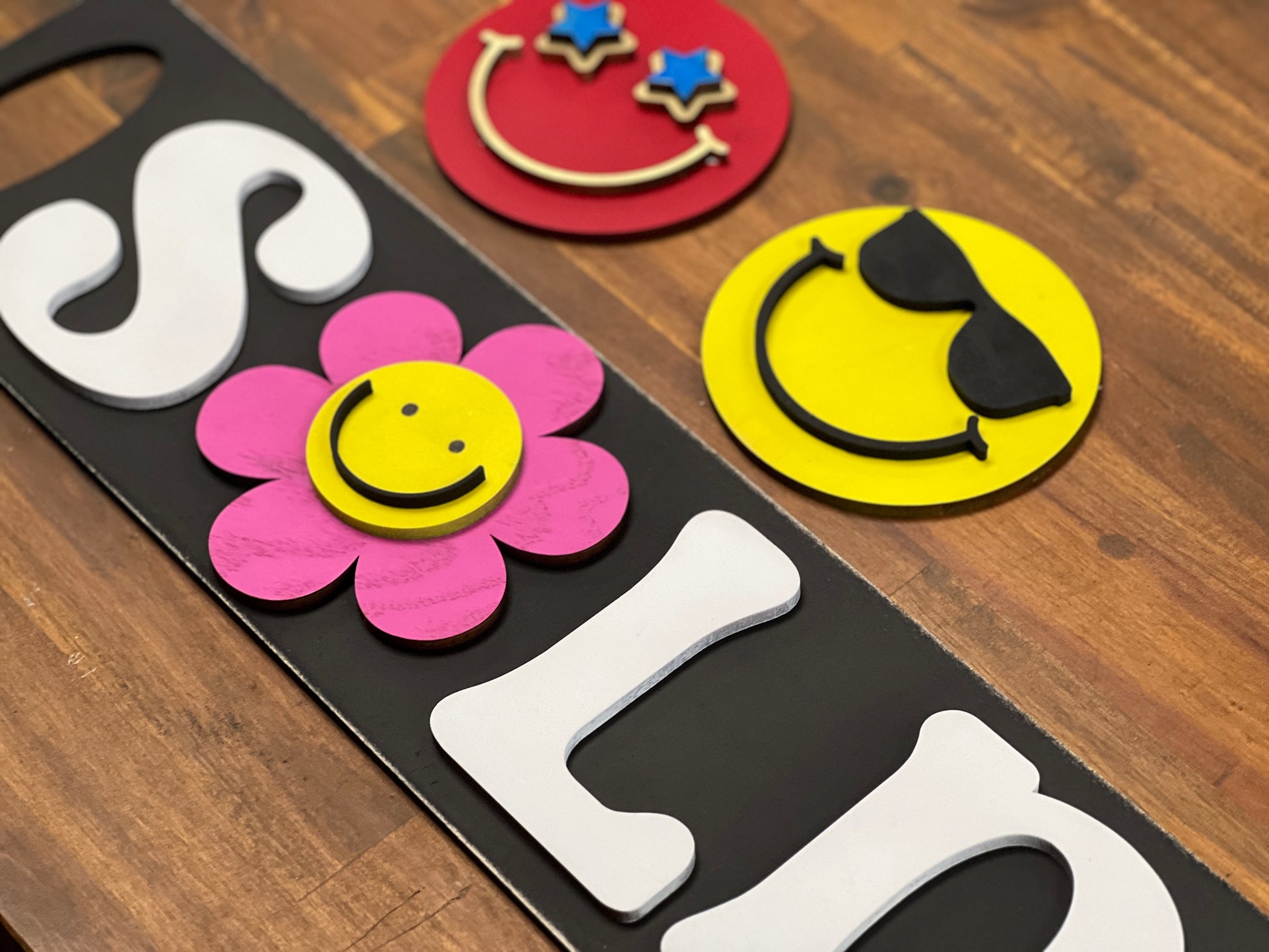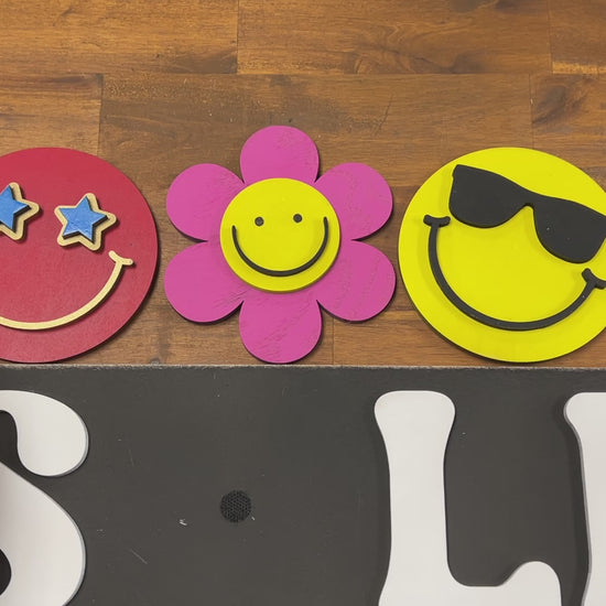 The example was made from Columbia Forest Maple Plywood from Home Depot. The backing and interchangeable pieces were made from 1/4". A set of adhesive velcro dots were used to attach and change out the smiley faces.