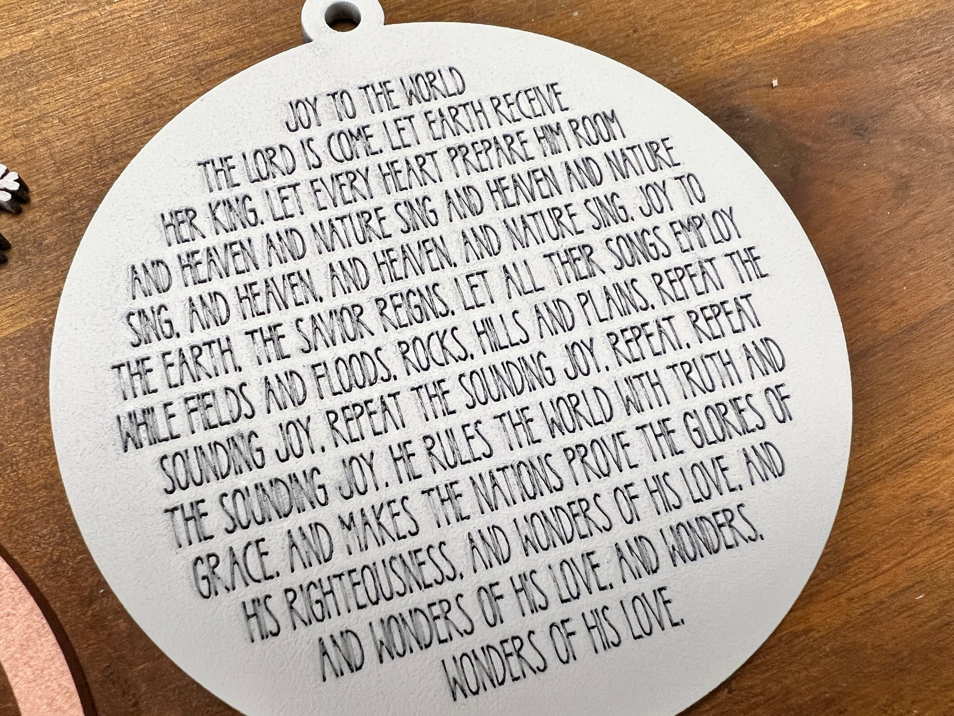 Ungrouped for easy cutting. Joy to the World layer can be cut from a variety of woods and layered over the engraved or scored bottom. Vinyl stencils could be cut from either as well. In the example photos, the top layer is cut from 5/32" Columbia Forest Maple Plywood from Home Depot. The bottom layer is scored (for a huge time savings!) and then lightly spray painted after scoring. It is scored on 1/4" Columbia Forest Maple from Home Depot. The star cuts separately so it is easy to paint!
