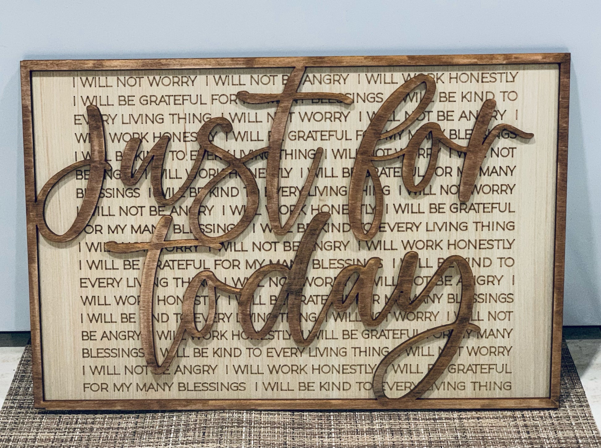 This beautiful piece is made up of two layers. The bottom layer is made of maple and is engraved. The top layer is can be painted or stained. The layers are glued together. Despite being a double layered piece, this is light enough to hang with command strips. This piece measures 18 x 10.5,