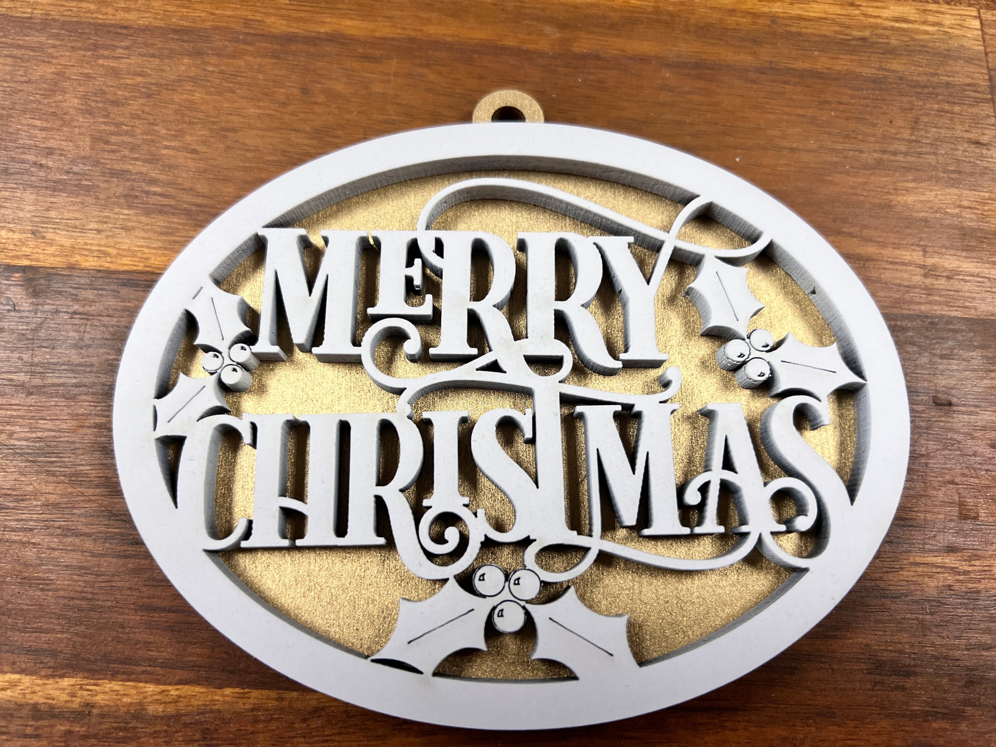 Ungrouped for easy cutting. Merry Christmas layer can be cut from a variety of woods and layered over the bottom. Vinyl stencils could be cut from either as well. In the example photos, the top layer is cut from 5/32" Columbia Forest Maple Plywood from Home Depot. The bottom layer is lightly spray painted after scoring.