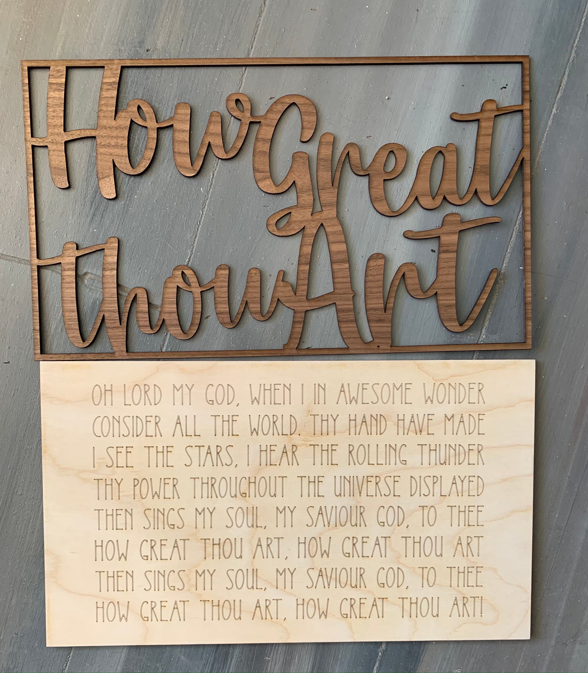 Ungrouped for easy cutting. How Great Thou Art layer can be cut from a variety of woods and layered over the engraved or scored bottom. Vinyl stencils could be cut from either as well. In the example photos, the top layer is cut from 5/32" Columbia Forest Walnut Plywood from Home Depot. The bottom layer is scored (for a huge time savings!) and then lightly spray painted white after scoring. It is scored on 1/4" Columbia Forest Maple from Home Depot.