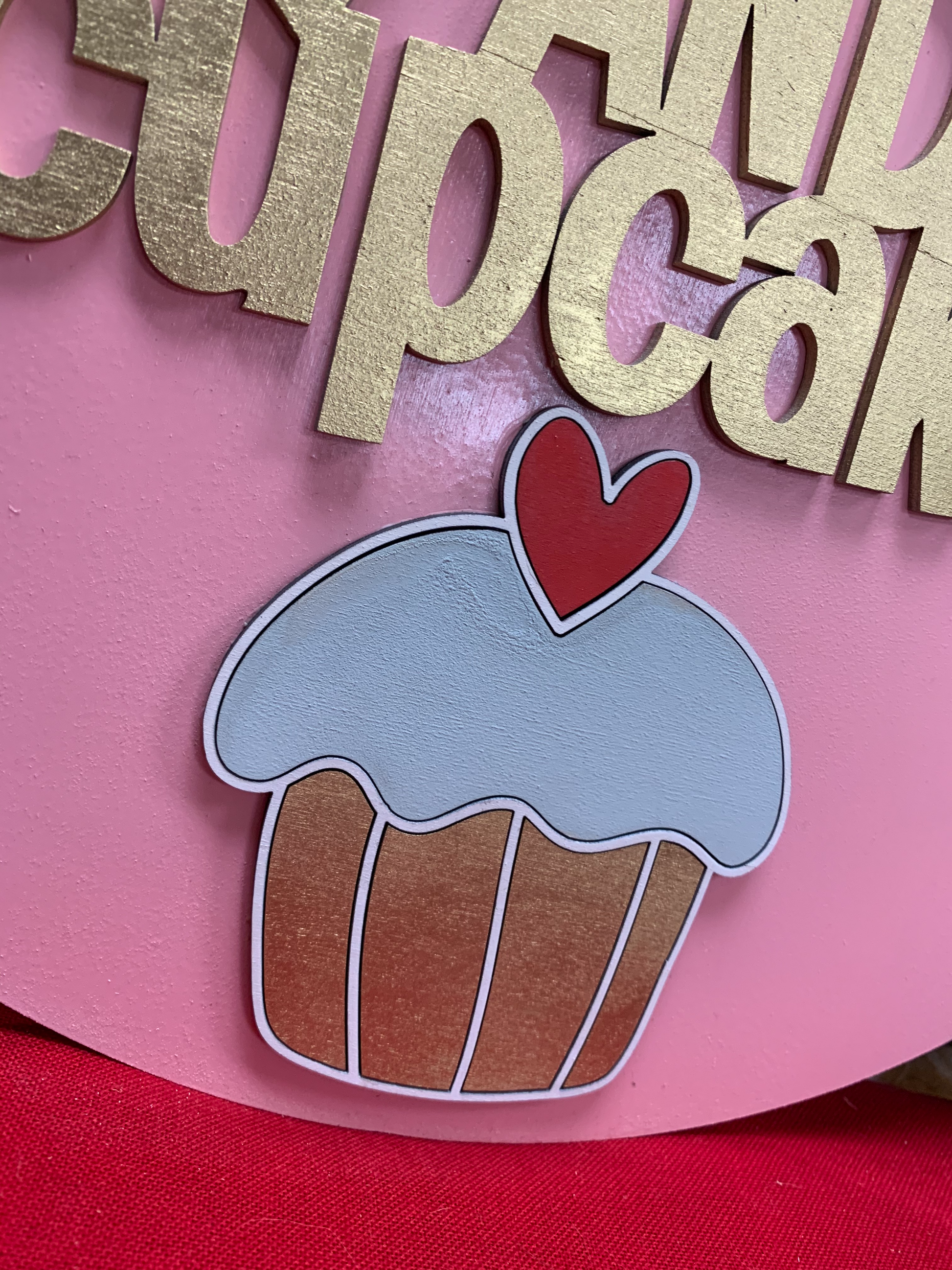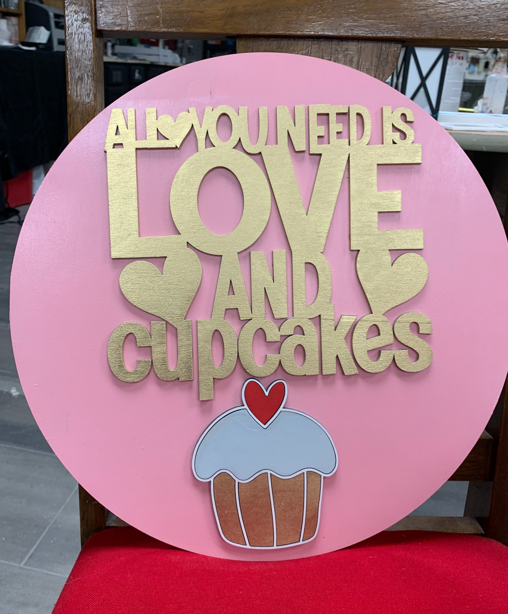 All you need is LOVE and cupcakes! This 15" round is made with a combination of birch and maple woods. The 15" round backing is the perfect size for a entryway or door hanger.