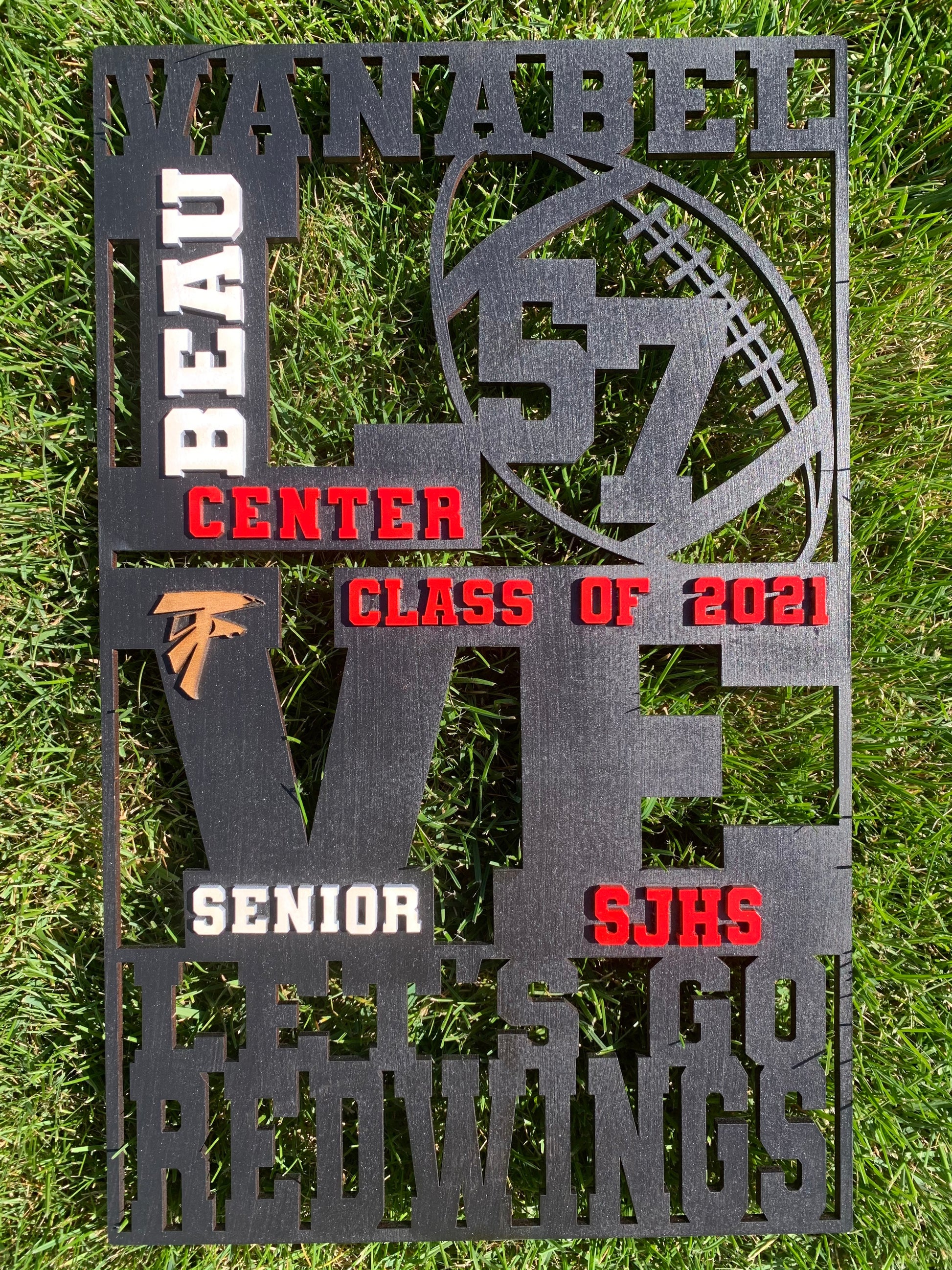 This custom piece is created with 1/4" maple and completely personalized! Can be painted or stained any color. Name, position, school and year accents are added using 1/8" maple. Everything is assembled, glued and sealed for indoor or outdoor use.