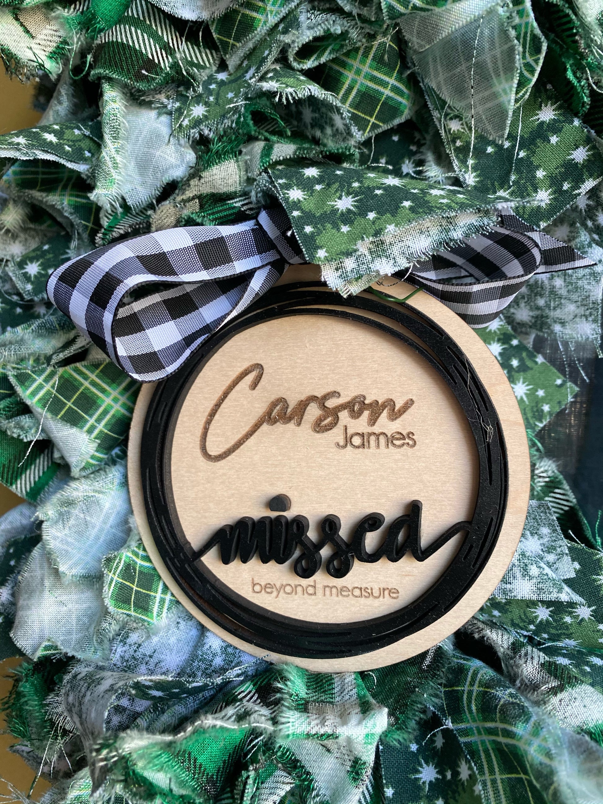 Double layered ornament made from 1/8” maple. Black wreath and natural background. Measures 4.5” in diameter. Personalized.