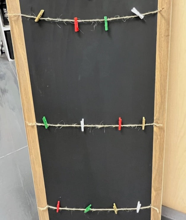 Create this festive holiday card holder at any DIY pARTy this fall! This piece measures 12 inches wide by 30" long and includes twine and clothes pins. After painting and staining your piece, you will be able to paint and add the layered wood to the top, then you will assemble the twine on site.