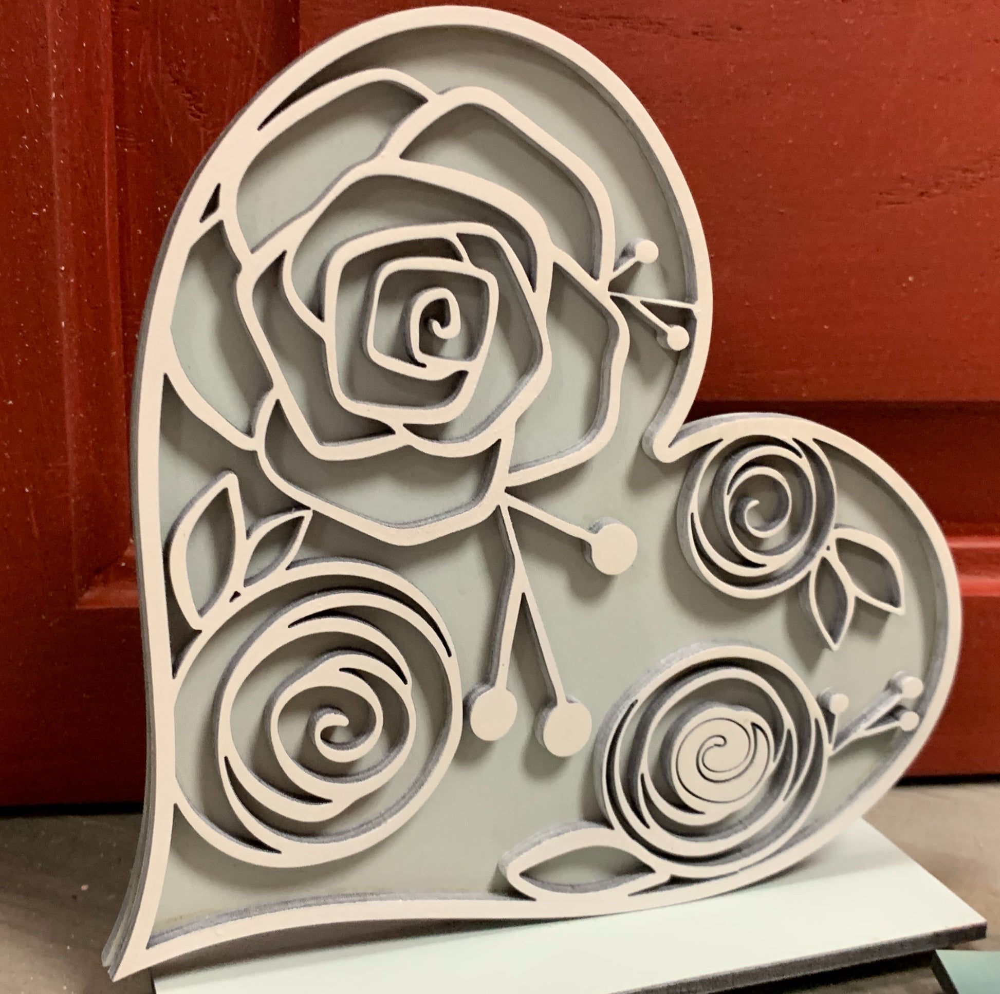 They measure 6.25", 5.5" and 4.5" and are made of two layers of 1/8" maple. The base is also double layered and allows the heart to stand on it's own.