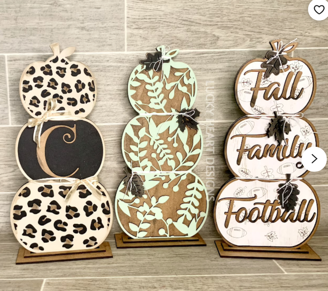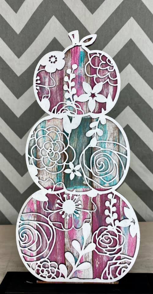 Perfect for the mantle, entry way or porch, these stacked pumpkins come in three sizes! The 18" and 24" sizes are made from 1/8" birch. The 48" size is made from 1/4" maple. They are layered to create a fun, easy to paint look! a set of layered leaves are included! There are many ways to paint your pumpkins. Sara will walk you through a few techniques. All paint and glue is provided.